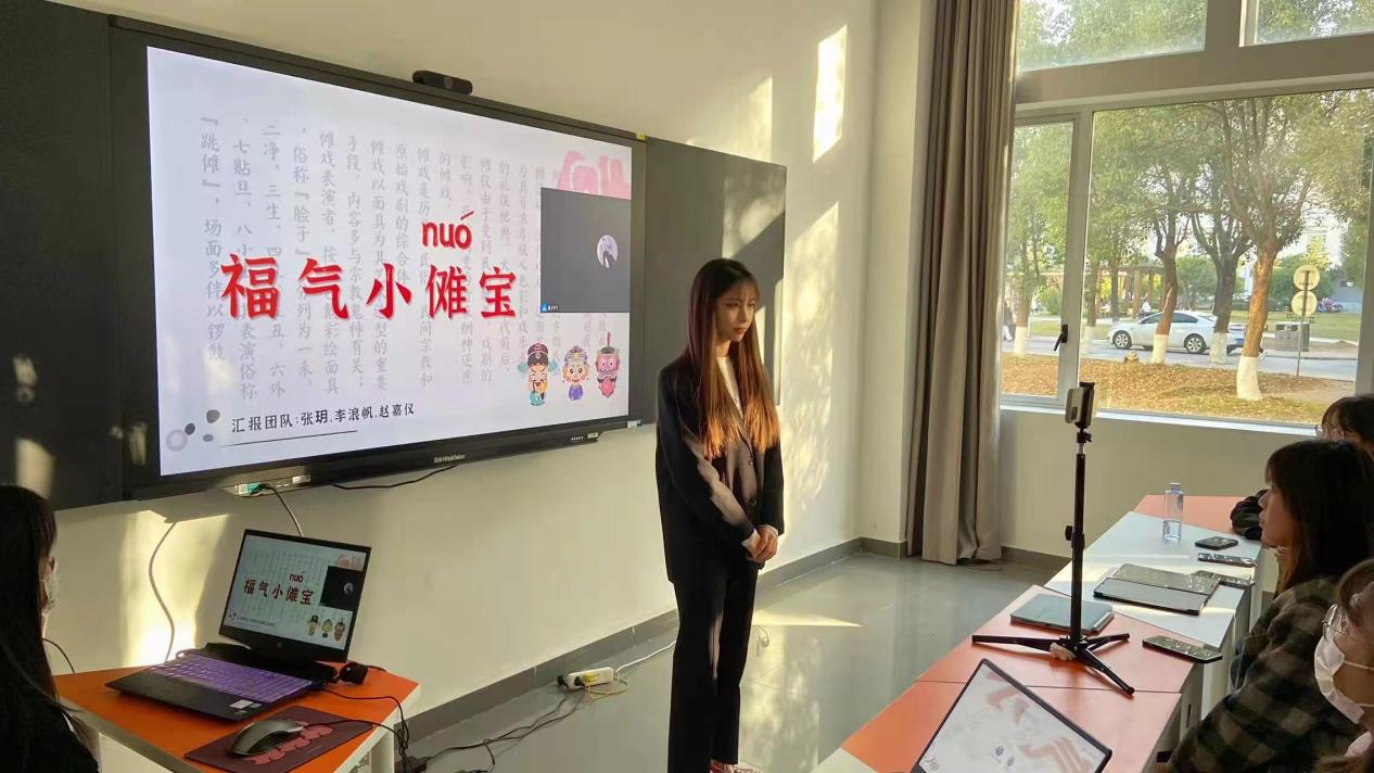 张玥、李浪帆、赵嘉仪组建的团队的获奖作品《福气小傩宝》是表情包IP设计,基于对傩文化内涵的挖掘与提炼,开发了日常系列与新年系列两类表情包。在设计中以头大身小为标准,重点在头部和服饰上体现傩戏的特色,肢体动作和文字为辅助,让呆板的傩戏趣味化。