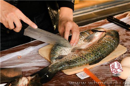 该班男生邹思昊做了一道拿手菜“脆皮鱼”,色泽诱人、香味四溢,刚出锅就吸引了众多“吃货”虎视眈眈。食堂的师傅还亲手雕了一朵“西红柿花”为这道菜摆盘。