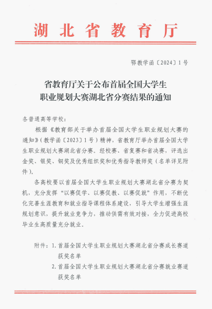 近日,由湖北省教育厅主办,湖北大学承办的首届全国大学生职业规划大赛湖北省决赛落下帷幕。我校文化管理学院电子商务专业学生赵星星荣获全国大学生职业规划大赛湖北省分赛银奖。我校荣获全国大学生职业规划大赛湖北省分赛优秀组织奖。