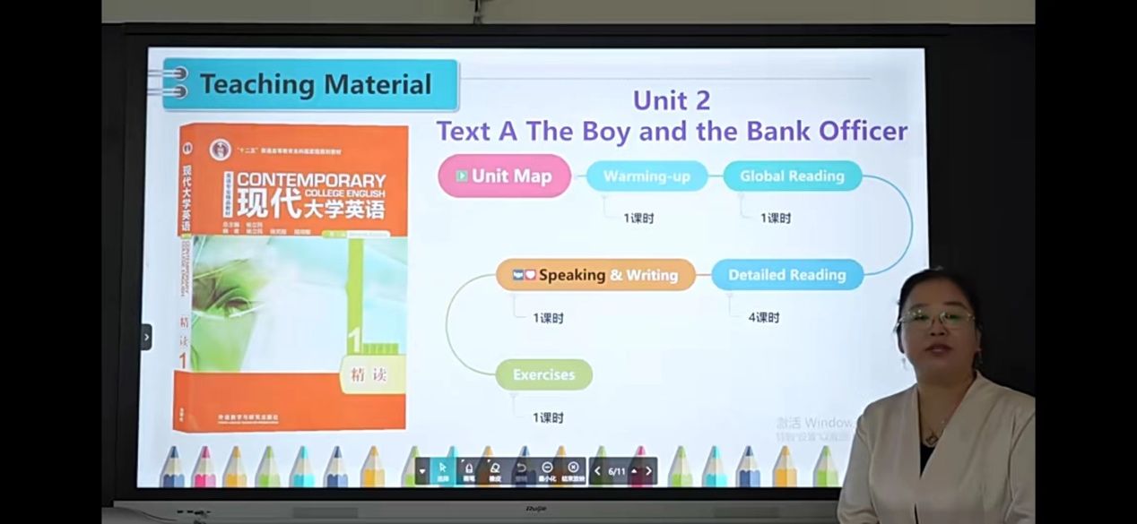 结合本次大赛主题,我校团队选择将《综合英语1》作为参赛教材,邓欢老师作为团队负责人进行说课视频录制,并结合团队成员张晓磊老师的教育戏剧特色,完成了单元教学设计和展示课时教学设计的撰写工作。团队成员沈君仪老师负责录制45分钟的真实课堂教学。