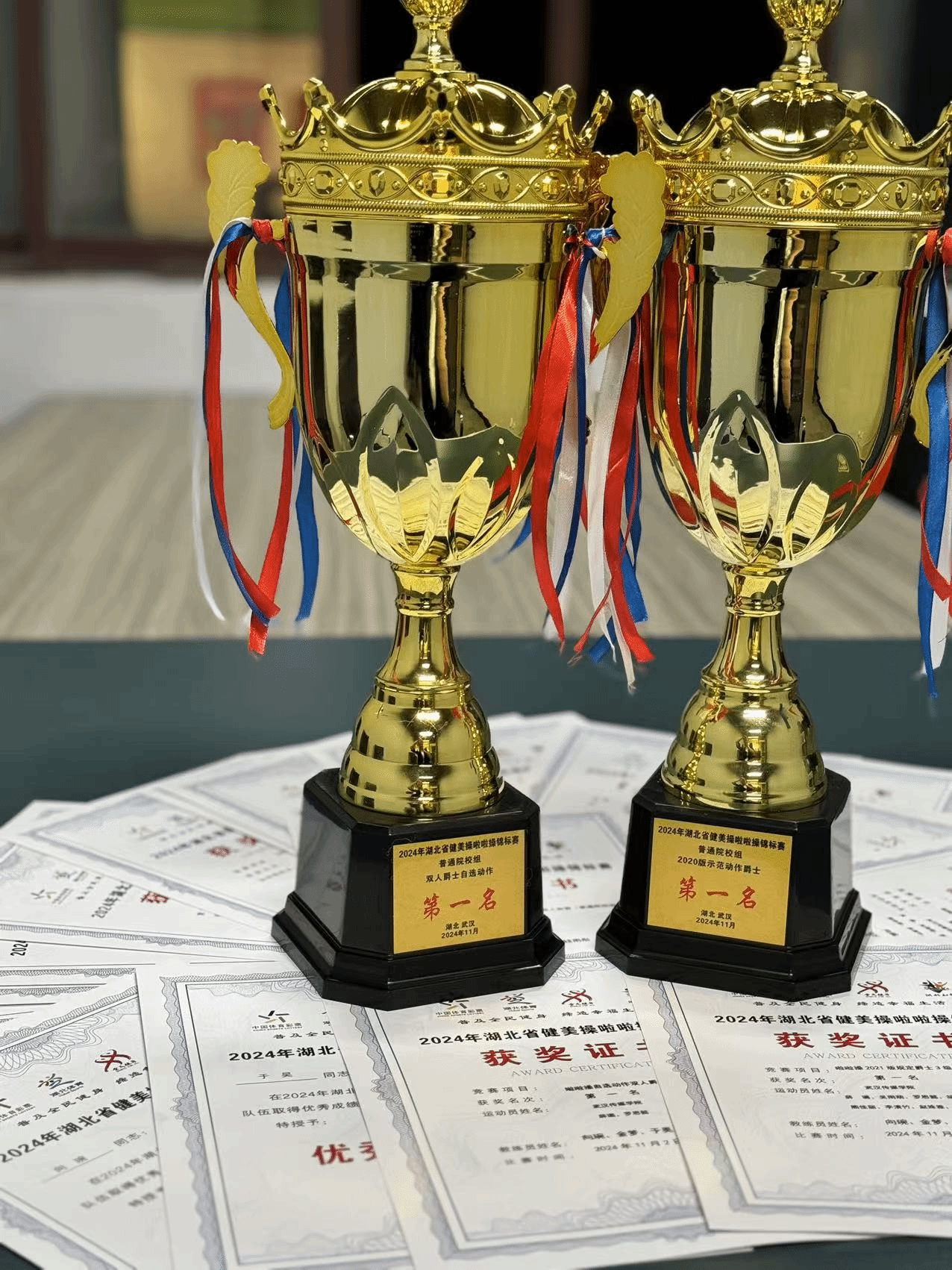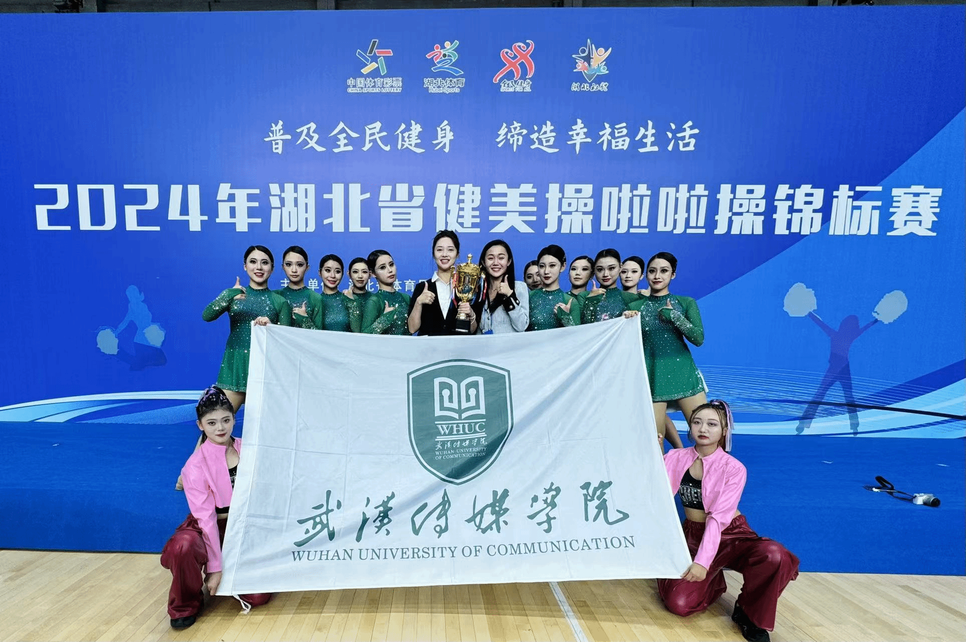 新闻与媒体中心网讯(文/记者 陈栎依 图/由金梦老师提供 编辑/徐佳仪)2024年湖北省健美操啦啦操锦标赛于11月2日至3日在武汉软件工程职业学院开赛。我校电影与电视学院薛璐、吴雨萌等13名学生代表我校在此次比赛中荣获双人爵士自选动作第一名、2021版规定爵士三级第一名的佳绩。本次比赛由我校电影与电视学院表演系主任向琬老师领队,表演系于昊老师、金梦老师、钱雨彤老师担任教练员。