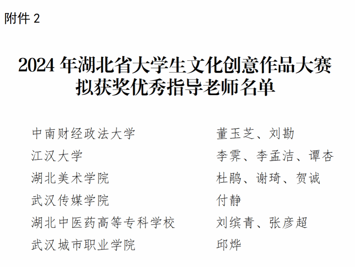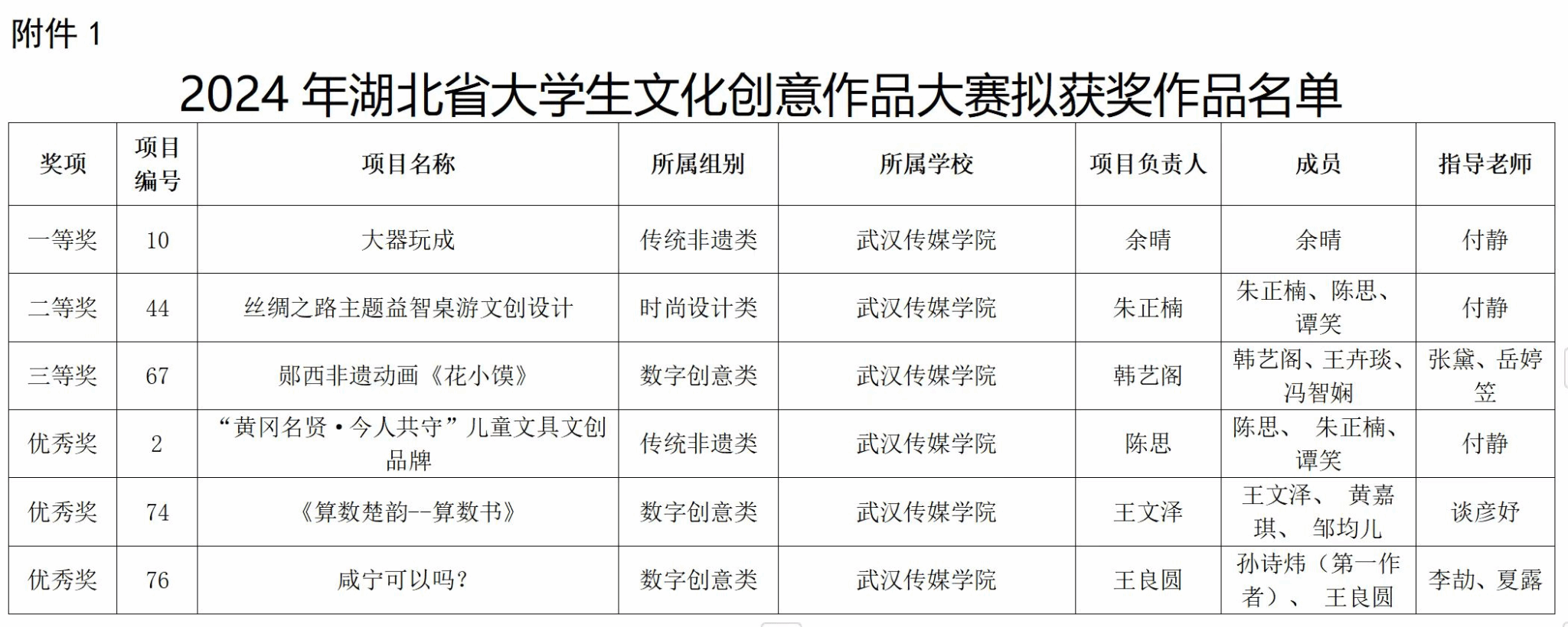 2024年湖北省大学生文化创意作品大赛由湖北省高等学校毕业生就业指导服务中心、湖北省大学生创新创业俱乐部主办,旨在构建一个全面、多维度的文化创意作品展示与交流平台。我校将继续坚持应用型人才培养目标定位,激发学生文化创新创造热情,培养学生创新实践能力,为推动传统文化的创新性发展、促进我国文化创意产业高质量发展贡献力量。