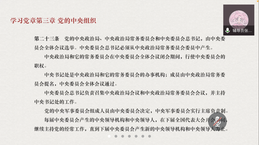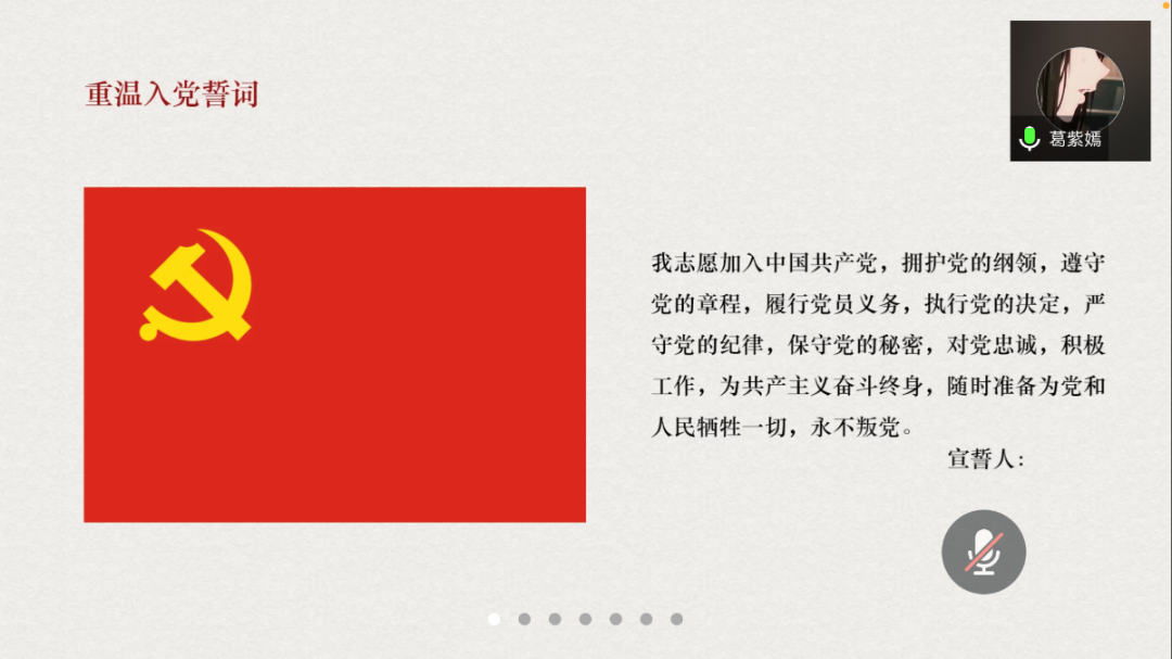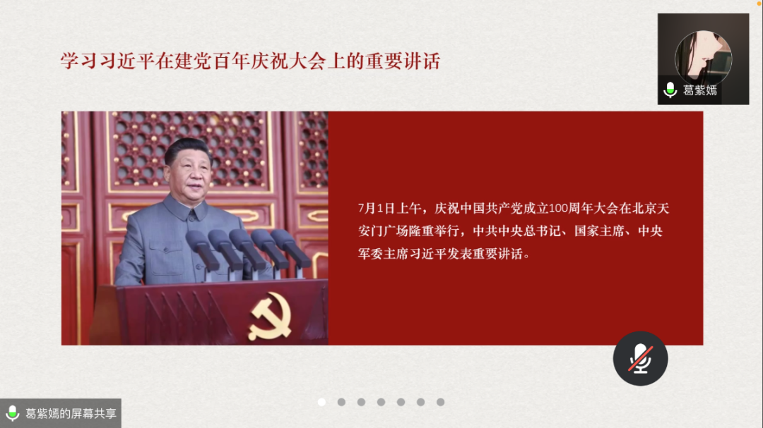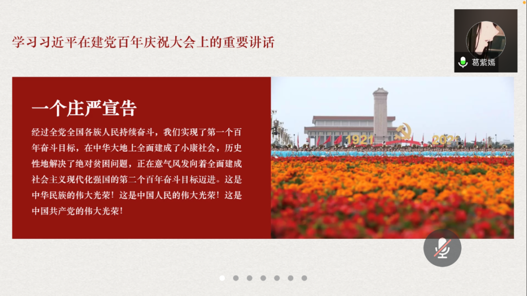 葛紫嫣同志以“一个庄严宣告”、“一个伟大梦想”、“四个伟大成就”、“一个伟大精神”、“一个殷切期望”等关键词为引,带领全体同志回顾学习了习近平在建党百年庆祝大会上的重要讲话。