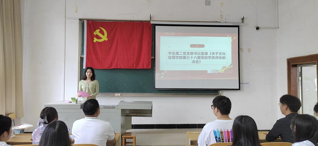 为弘扬百年党史,争做时代新人。落实党的二十大精神,为党组织选拔、培养、输送优秀青年,5月5日中午,文化管理学院分党校第三十八期党校工作结业式在5204教室举行。文化管理学院党总支部书记、分党校校长张爱军,学生第一党支部书记王喆,学生第二党支部书记陈可冉, 党总支部组织委员武思雨, 团委书记汪丰毅,优秀教工党员代表袁知兰出席本次结业典礼。