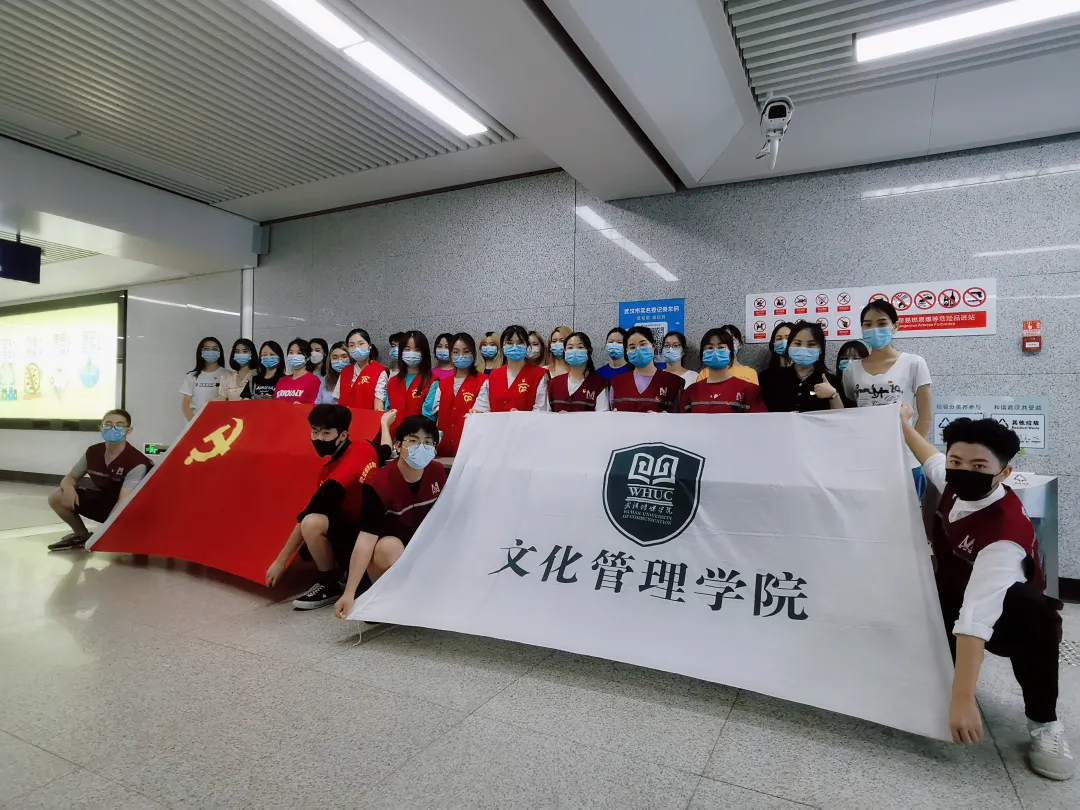 在活动开始前,文化管理学院组织员武思雨带领同学前往武汉轨道交通二号线沿线踩点,联系站点地铁负责人,进行沟通、商量活动相关事宜,为地铁志愿服务活动争取到了官方支持。老师和志愿者们将印有党史知识的不干胶粘贴到矿泉水瓶上,志愿者们将物资搬运到各个站点,每个站点分别分发了两箱矿泉水和四包手帕纸。