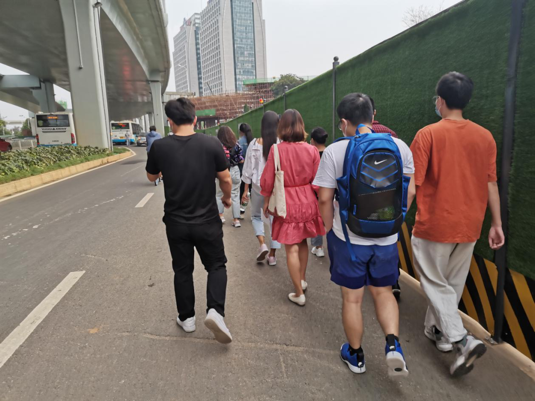 出于安全的考量,本次志愿下沉社区服务由学生党支部书记李雅婷老师带队,全体成员一同步行前往长咀社区居委会。路上,党员志愿者们充满了热情,积极地和老师交流此次活动的相关事宜。