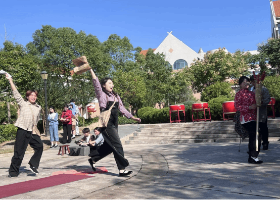 在儿童福利院的小广场,以天为幕,以地为台,同学们为孩子们表演了原创音乐课本剧《卖报童》,该剧由沈洁老师指导学生创编,以小学音乐课本为基础,以武汉小报童为历史原型,运用奥尔夫乐器、歌唱、舞蹈律动、声势律动等音乐元素表现报童们在艰苦的条件下携手同行、互帮互助的情景,塑造天真活泼的报童形象,反映旧社会报童不幸的童年生活,又表现了他们积极向上、对光明的未来充满希望的乐观主义精神。现场同学们的演出真情投入,获得了孩子们的热烈欢呼和掌声,还有孩子情不自禁地走上前去跟同学们一起舞蹈,沉浸在快乐和幸福中。用音乐讲好中国故事,展演红色课本剧,与福利院的孩子们一起重温经典,感受生命的力量。