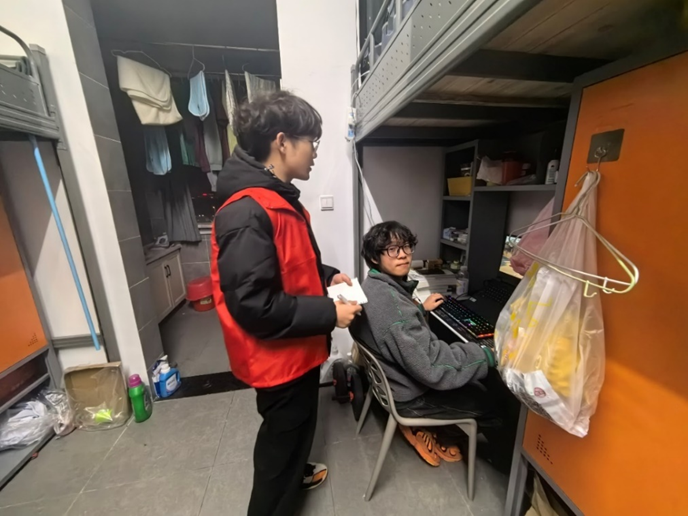 E栋楼长,层长以及寝室长们身穿红色志愿服于E栋一站式门口集结,每位层长带领本层的志愿者深入寝室进行消防安全知识讲解和消防隐患排查。