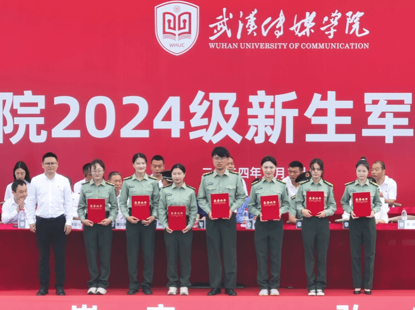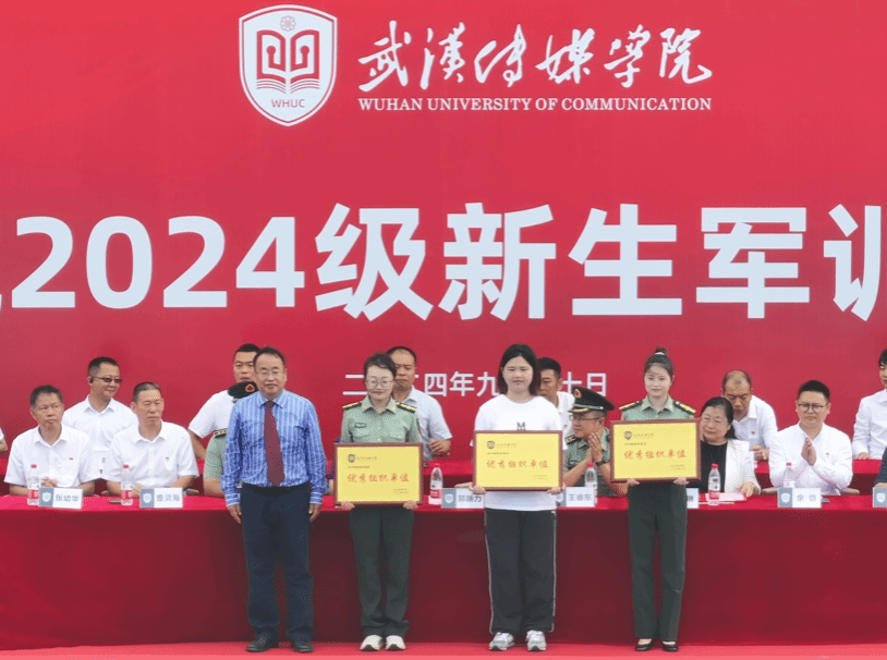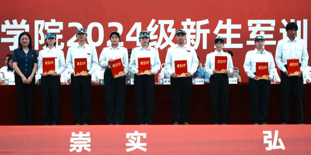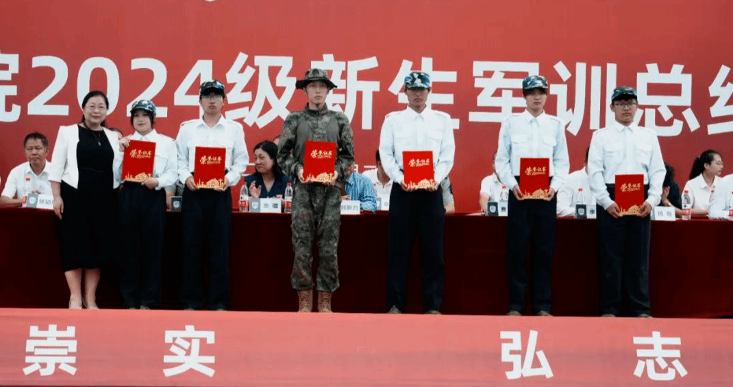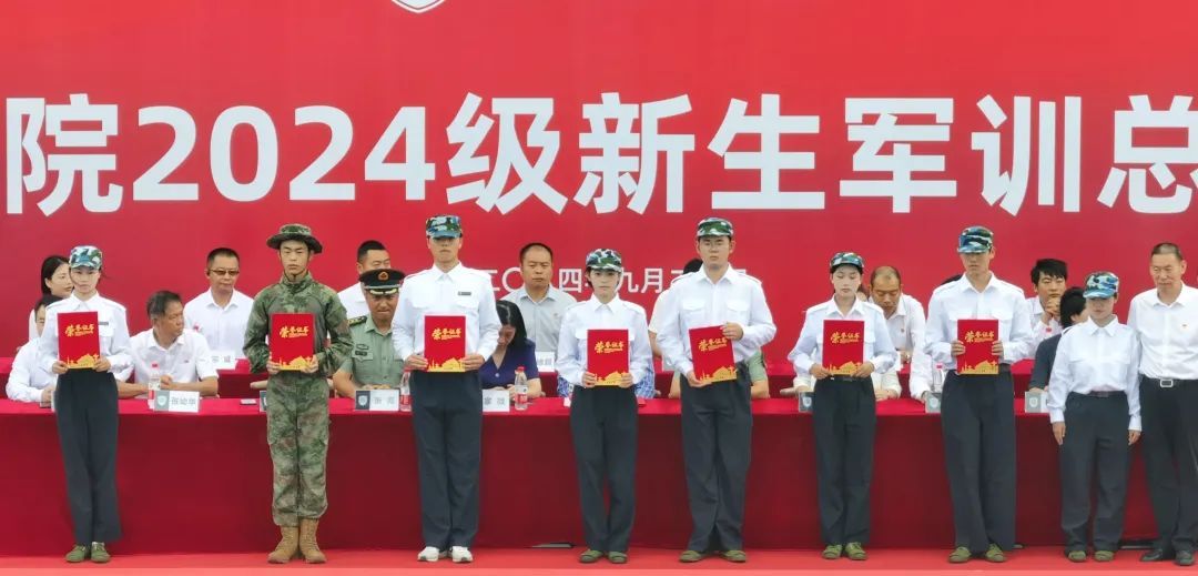 副校长曹琳宣读《关于表彰2024级军训先进集体与先进个人的决定》。经学院和承训部队推荐、评选,学校审核,决定授予十连等4个连队、四营等4个营队“歌咏比赛优胜单位”荣誉称号;授予新闻传播学院、文化管理学院、传媒技术学院3个学院“优秀组织单位”荣誉称号;授予二连等19个连队“优秀连队”荣誉称号;授予王梓安等16名同志“优秀教官”荣誉称号;授予方锦华等7名同志“优秀指导员”荣誉称号;授予范宇豪等291名同学“优秀学员”荣誉称号。随后,校领导为军训的先进集体与先进个人进行颁奖。