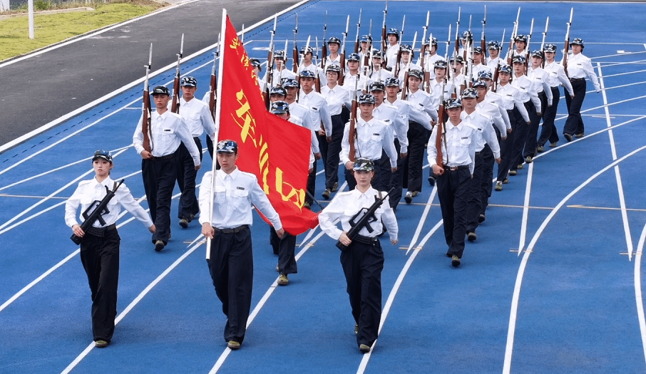 参训学生进行军训成果展示。伴随着《分列式进行曲》昂扬的旋律,受检阅方队精神抖擞、队列整齐、口号响亮,依次通过主席台前。