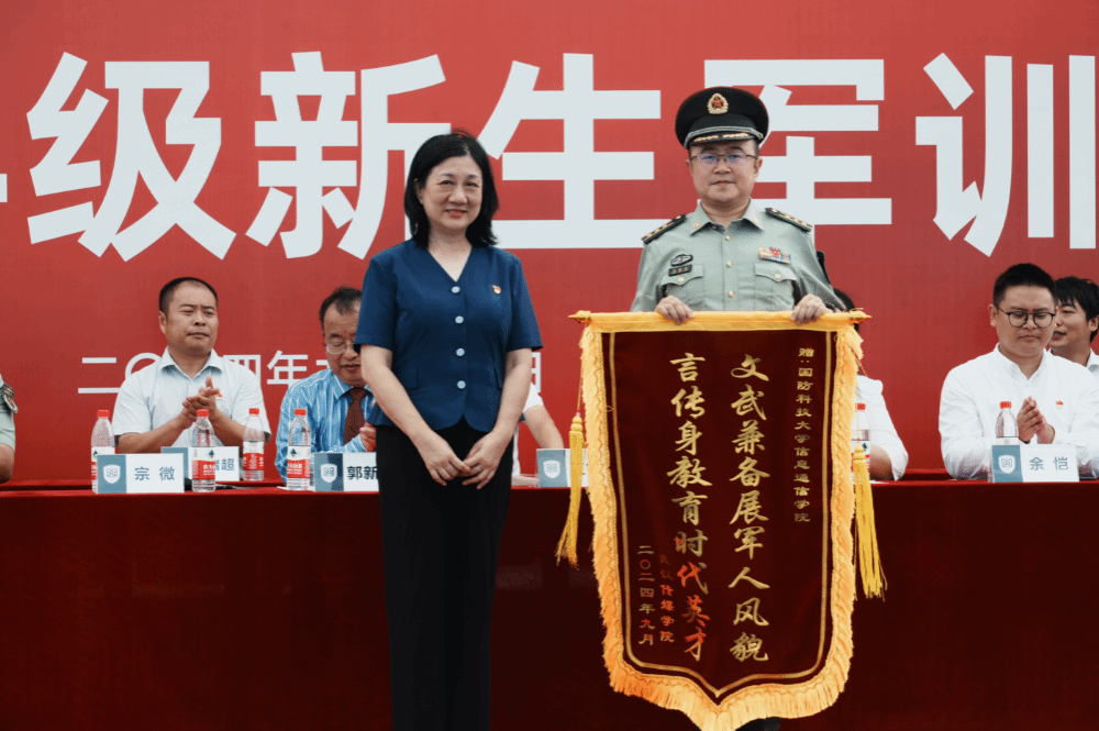校党委副书记、常务副校长宗微向承训部队赠送了锦旗,向全体现役教官和组织学生军训工作的老师们表达衷心的感谢,向刻苦训练、圆满完成军训任务的同学们表示热烈的祝贺。