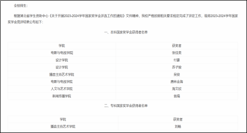 大会最后,由主持人宣布竞评结果,经评委投票确定电影与电视学院张佳美、设计学院付豪、设计学院苏子骏、播音主持艺术学院吴俊、电影与电视学院唐林金海、人文与艺术学院海文欣、新闻传播学院翁瑞、播音主持艺术学院刘畅8名学生通过竞选获得乐竞平台2023-2024学年国家奖学金评定资格。