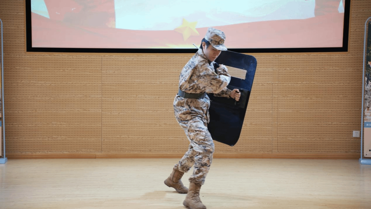 在军事科目展示环节,迷彩协会赵晓军、侯东枝、封傲三位退役同学向我们展示军事科目刺杀操、警棍盾牌操,展示了强健的身体素质和过硬的军事技能。