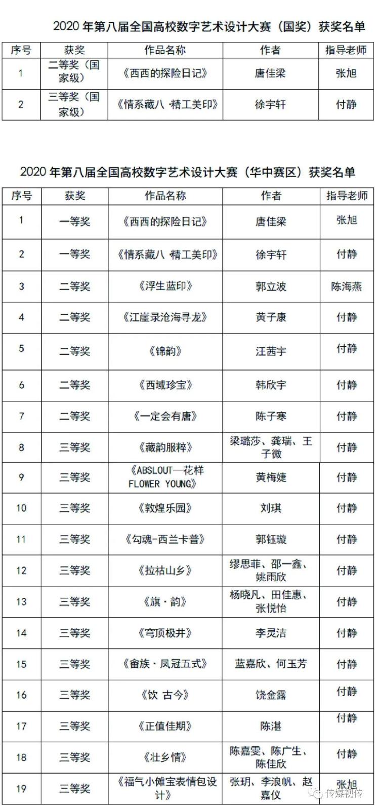 “未来设计师”杯第八届《全国高校数字艺术设计大赛》全国共有1106所高校参赛,共征集60113幅作品,其中中华赛区有114个参赛高校,共征集4893件。视传学子突出重围,斩获19个奖项,其中全国二等奖1项、三等奖1项;华中赛区一等奖2项、二等奖5项、三等奖12项。