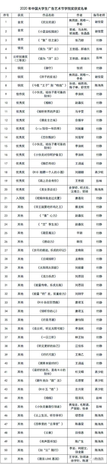 2020年第12届全国大学生广告艺术大赛共收到来自全国29个赛区1582所院校共计535982组作品,最终共30589组作品入围全国总评审,本届大广赛于9月15日落下帷幕。 我校设计学院视传师生共有6组作品获得大广赛优秀奖。其中获得金奖3项,银奖1项,创意奖1项,铜奖3项,佳作奖1项,优秀奖11项。
