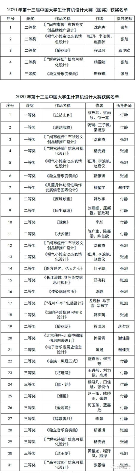 据悉,中国大学生计算机设计大赛是由教育部高等学校计算机类专业教学指导委员会、教育部高等学校软件工程专业教学指导委员会、教育部高等学校大学计算机课程教学指导委员会、教育部高等学校文科计算机基础教学指导分委员会、中国教育电视台联合主办,是为培养具有运用信息技术解决实际问题的综合实践能力人才的重要竞赛项目之一。 我校设计学院视传师生在2020年第十三届中国大学生计算机设计大赛共获得31个奖项,其中国家赛获得二等奖3项,三等奖2项。