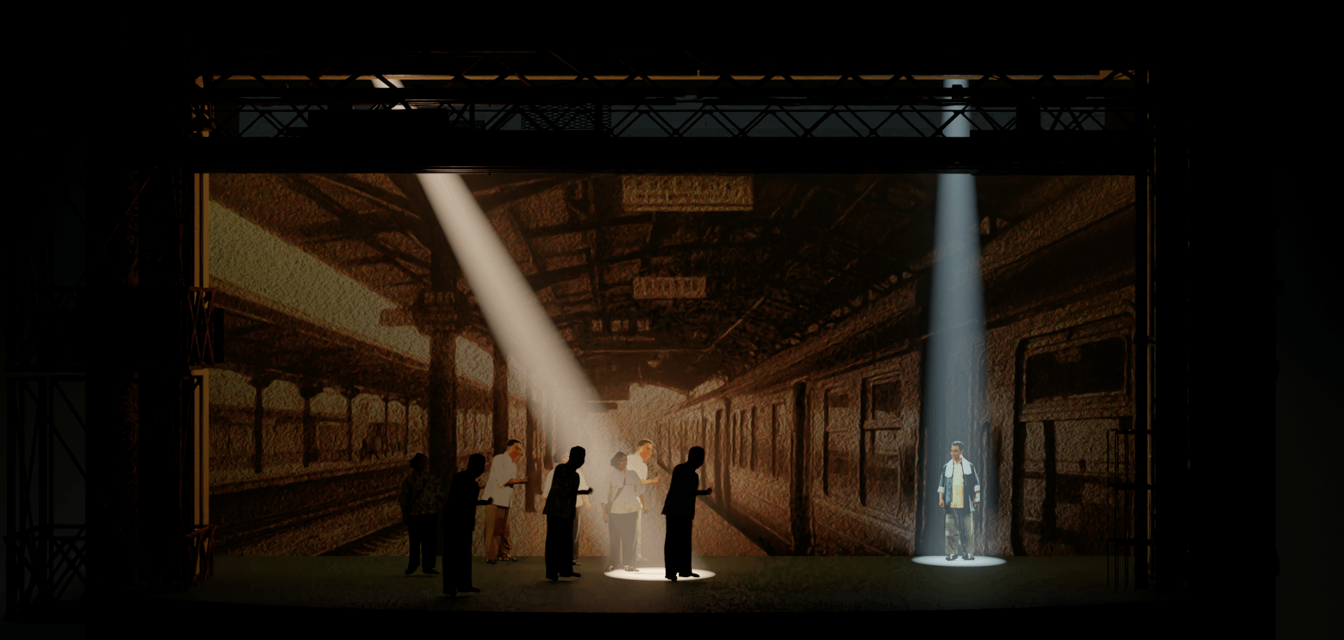 “这部剧横跨半个世纪工业史,舞美设计既要还原时代质感,又要传递精神象征。” 贾思介绍,创作团队创新运用平台、楼梯构建高低错落的节奏空间,为演员表演提供丰富的行动路径;同时融入机械元素构建工业美学视觉符号,并借助多媒体投影实现车间场景与精神意象的时空叠化。这种虚实结合的设计,让舞台既是表演空间,更成为承载历史与精神的艺术载体。在这一过程中,学生深度参与专业全流程,实现了 “教、学、做” 一体化的教学目标。