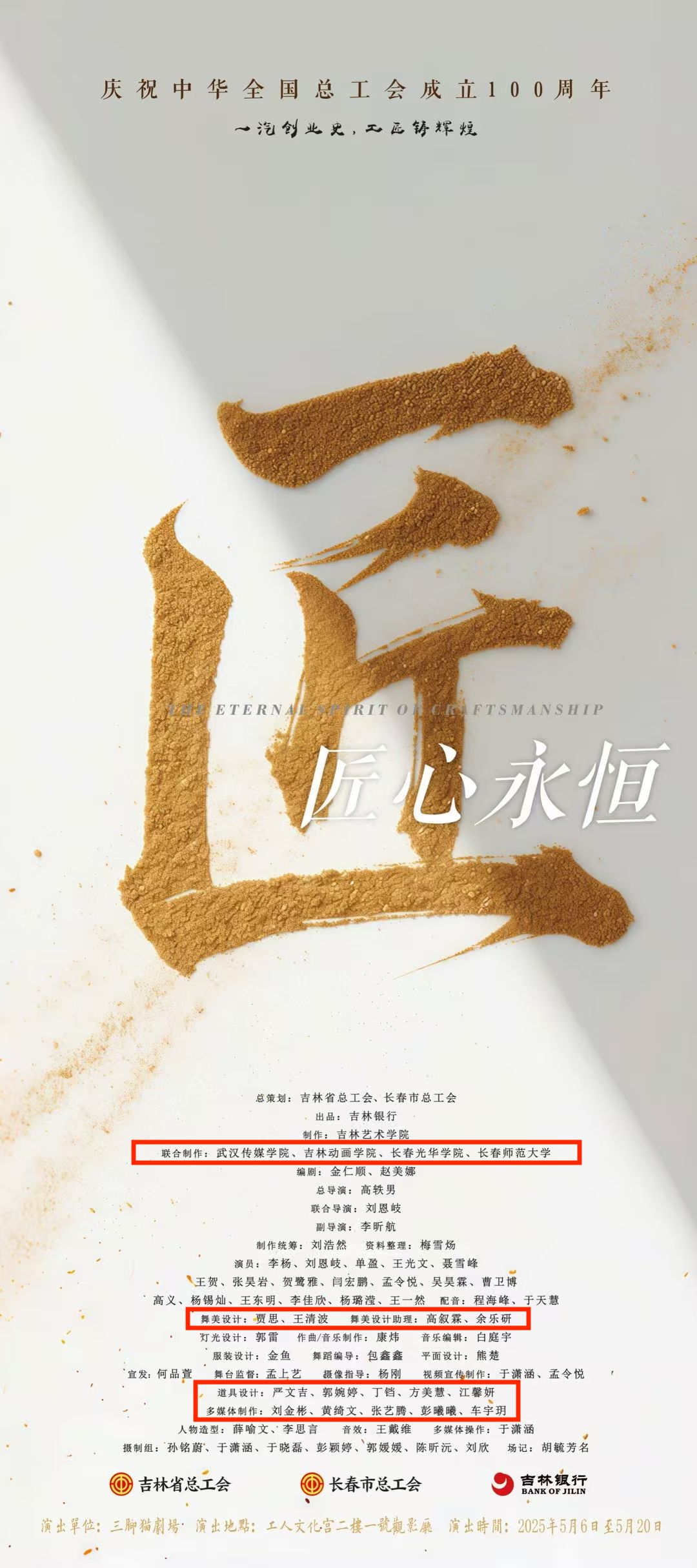 为庆祝中华全国总工会成立100周年,5月8日晚,由吉林省总工会、长春市总工会总策划,吉林银行出品,吉林艺术学院原创的大型现实题材话剧《匠心永恒》在长春市工人文化宫首演。该剧以长春第一汽车制造厂为背景,讲述三代匠人的动人故事。值得关注的是,乐竞平台设计学院戏剧影视美术设计系师生团队受邀参与舞美创作,以 “行走的课堂” 实践模式,打造出兼具艺术性与功能性的舞台美术体系,成为教学与行业深度融合的生动范例。