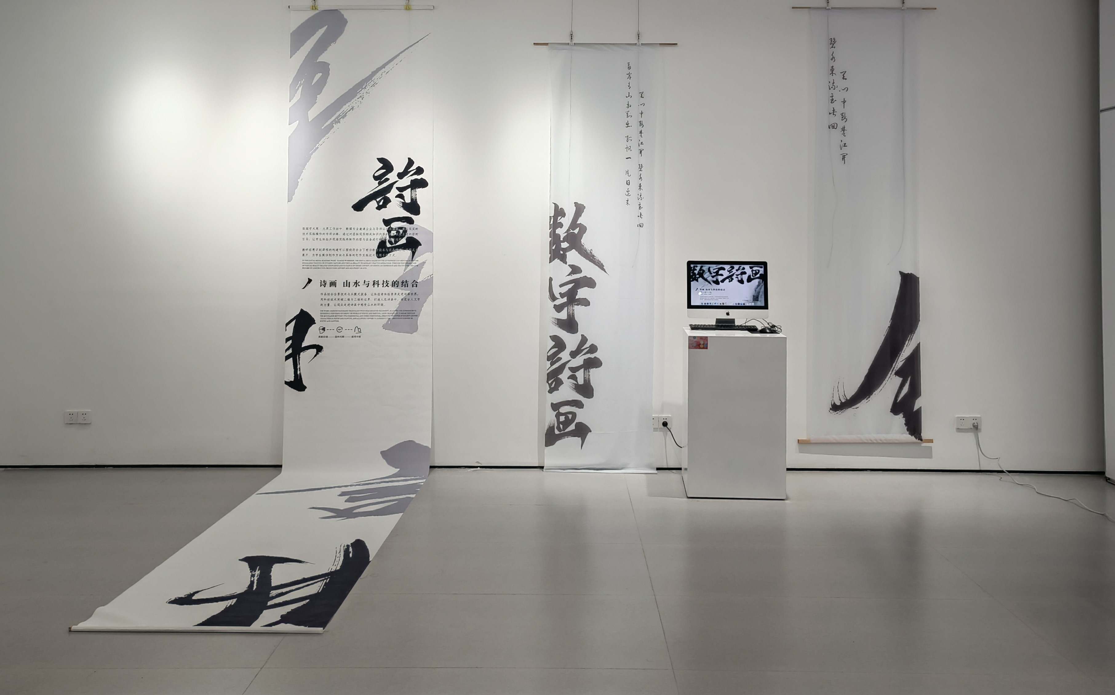 在展厅内,一组诗画场景布置格外吸引眼球。“眼前场景通过虚拟增强技术、AR眼镜,可以将参观者带入立体三维空间。”数学媒体艺术专业教师喻昕表示,他们团队三名老师通过两周时间设计好三维建模,软件均是自己设计。