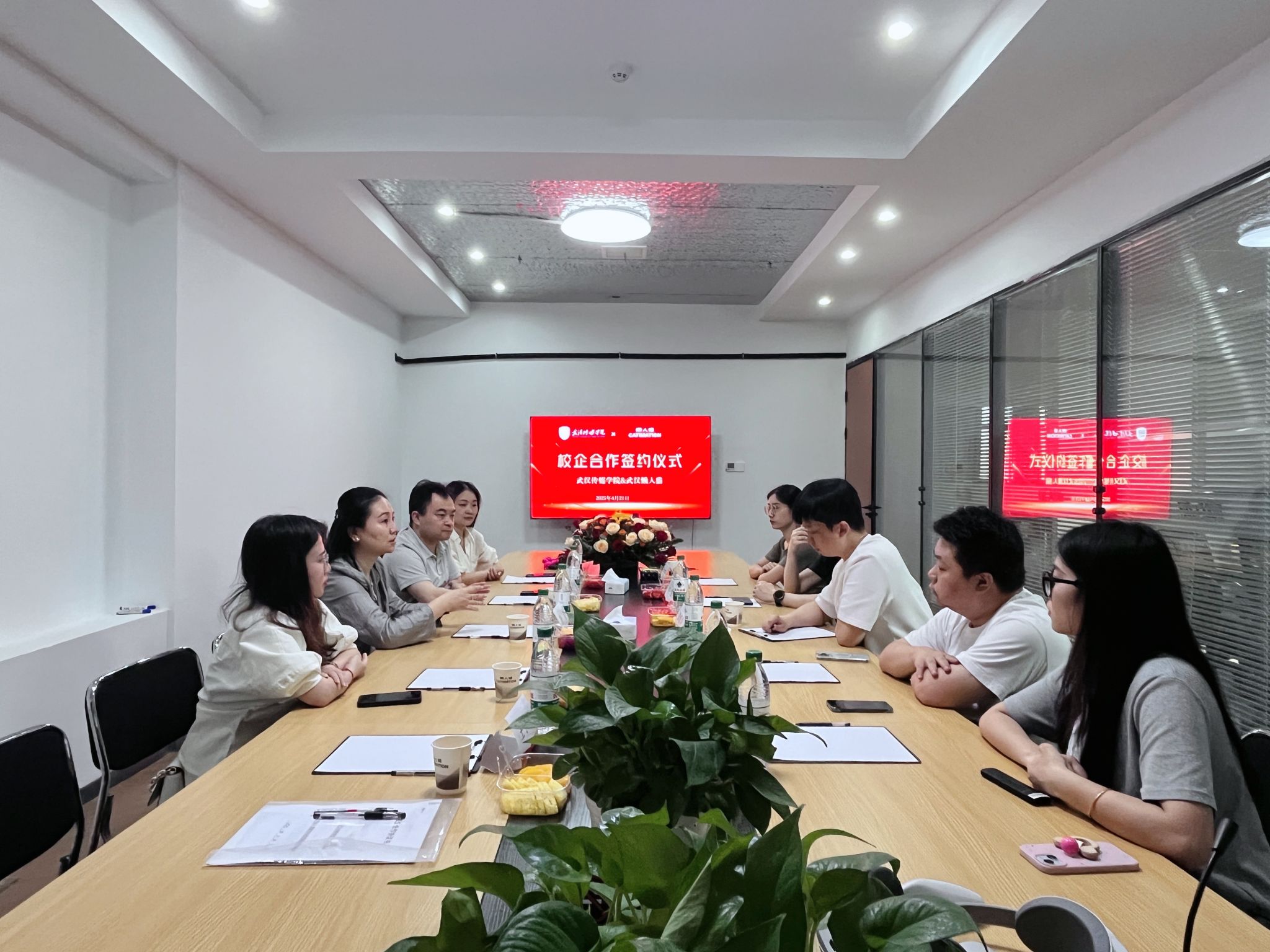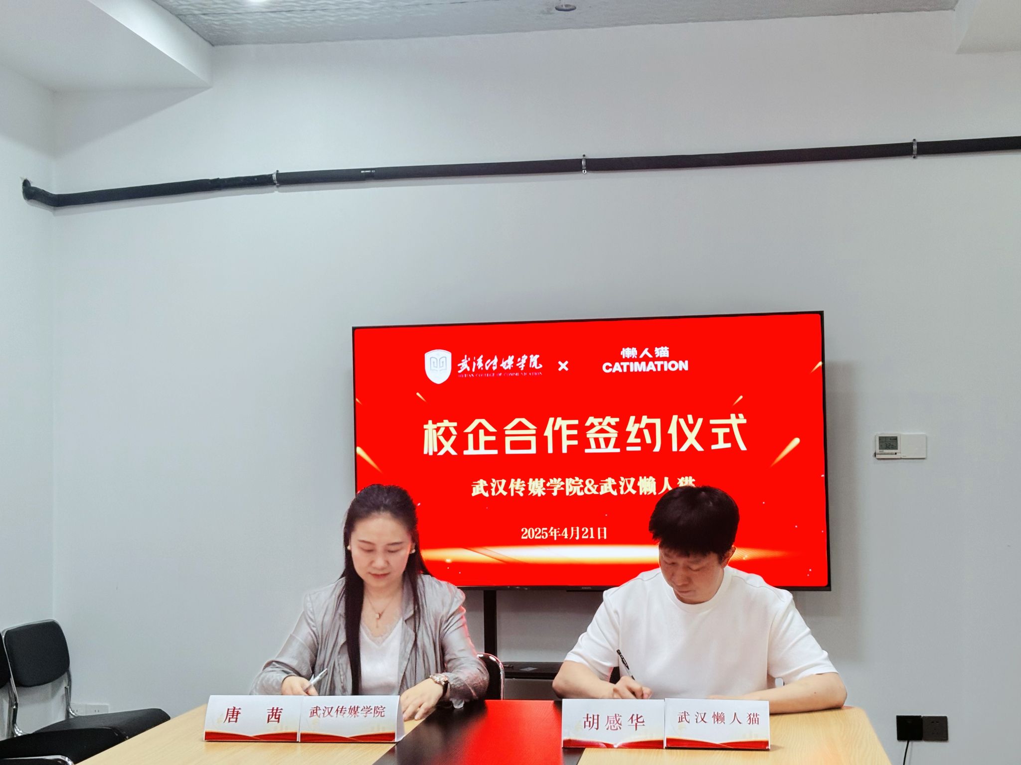 为积极响应国家深化产教融合、促进教育链、人才链与产业链有机衔接的政策号召,4 月 21 日,我校设计学院院长唐茜、党总支部副书记王龙、环境设计教研室副主任沈婧及骨干教师汪润、王子文等一行前往武汉懒人猫数字科技有限公司,开展校企合作签约及授牌仪式。双方秉持 “优势互补、资源共享、互利双赢、共同发展” 的原则,正式开启携手共进、合作育人的新篇章。