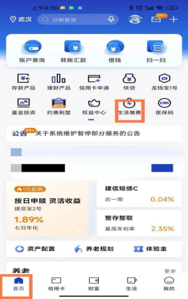 第二步:点击左下角“首页”,点击页面中的“生活缴费”