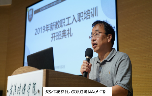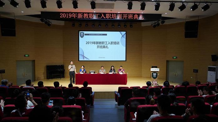 7月2日上午,我校在行政楼圆形报告厅举行2019年新教师入职培训开班典礼,拉开了2018-2019学年新进教职工培训的帷幕,全体校领导及各二级学院、主要职能部门负责人出席典礼,本学年新进的76名教职工参加了典礼,典礼由副校长胡学知主持,校党委书记郭新力代表校党委、校行政领导班子致欢迎辞并做培训动员讲话,校长助理、人事处(教师发展中心)处长姚晓菊同志为新教职全面解读了湖北省岗前培训的总体安排和我校今年两个阶段两周的校本培训方案及考核与纪律要求。典礼结束后,校领导、与会各学院及职能部门负责人与新进教职工合影留念。