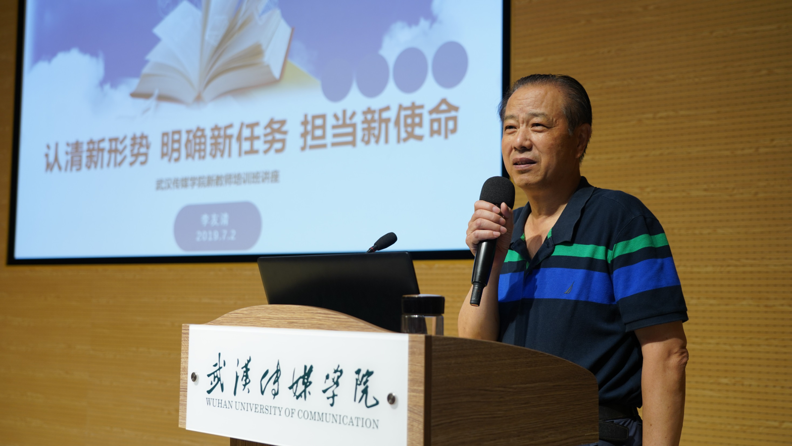 随后,特邀校外专家李友清教授为新进教职工做了《认清新形势,明确新任务,担当新使命》的主题报告,李友清教授站在时代发展的高度,高屋建瓴地从宏观理念形势到中观思路举措到微观职责方法,层层推进、满怀激情的给大家分析了新时代的特点大势,国家区域经济文化发展形势和高等教育质量革命的态势,指出在这个机遇与挑战并存,大有可为的时代,我们必须树立战略意识,把握好时代发展、高等教育发展和现代传媒业发展三大趋势,从八个一入手,落实好新高教四十条和建金专、建金课、建金师、建高地这四大核心任务,并特别对新教师如何建好金课,从理念、内容、方法、技术四个方面进行了详细的指导,号召新教师们要努力提高专业素养,作“四有”好老师,践行“四为”,站位讲台,唱响舞台!