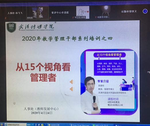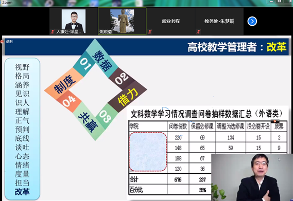 4月24日,“高校教学管理系列讲座”第四讲《从15个角度看管理者》继续由教师发展中心在ZOOM平台进行了直播,学校各学院党总支书记、教学副院长、教研室主任、教秘、行秘和全体行政职能部门副科级以上干部及教学管理相关人员等92人参加了本次培训。会议分两个会场,分别由学校校长助理、人事处(教师发展中心)姚晓菊和人事处(教师发展中心)处长助理王静主持。