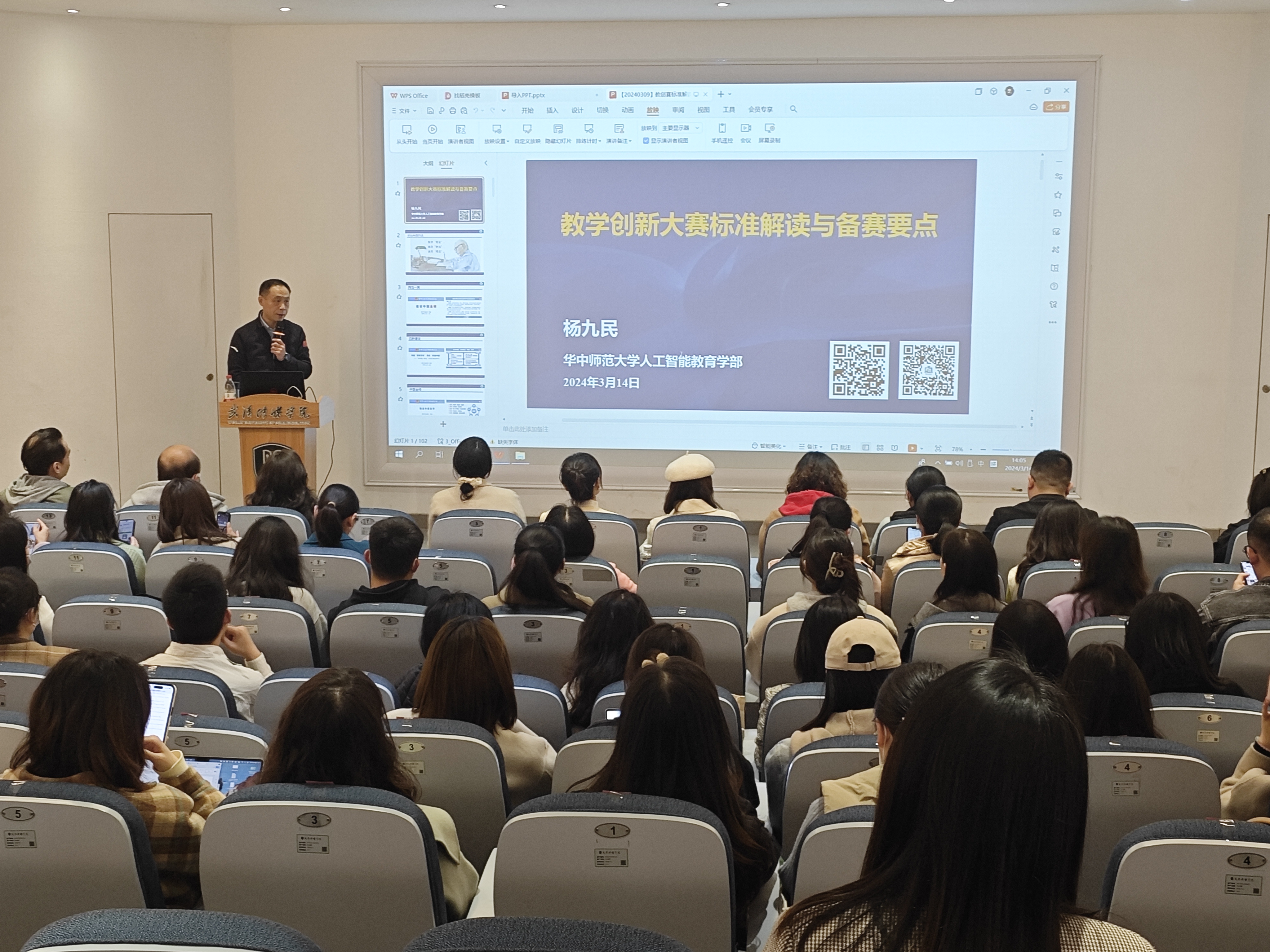 (通讯员 孟佳盈)为促进教育教学改革走向深入,助力“四新建设”,推动课程积极开展教学创新与实践,有效提高课程质量,2024年3月14日,乐竞平台教师发展中心开展了教学创新的内涵与实践路径为主题的讲座。讲座邀请博导,发展与教育心理学博士,湖北省教学名师,全国首届“明德教师奖”获得者,全国高校教师教学创新大赛国赛评委杨九民教授开展专题讲座。各学院院长、专业负责人、教师共100余人参加。